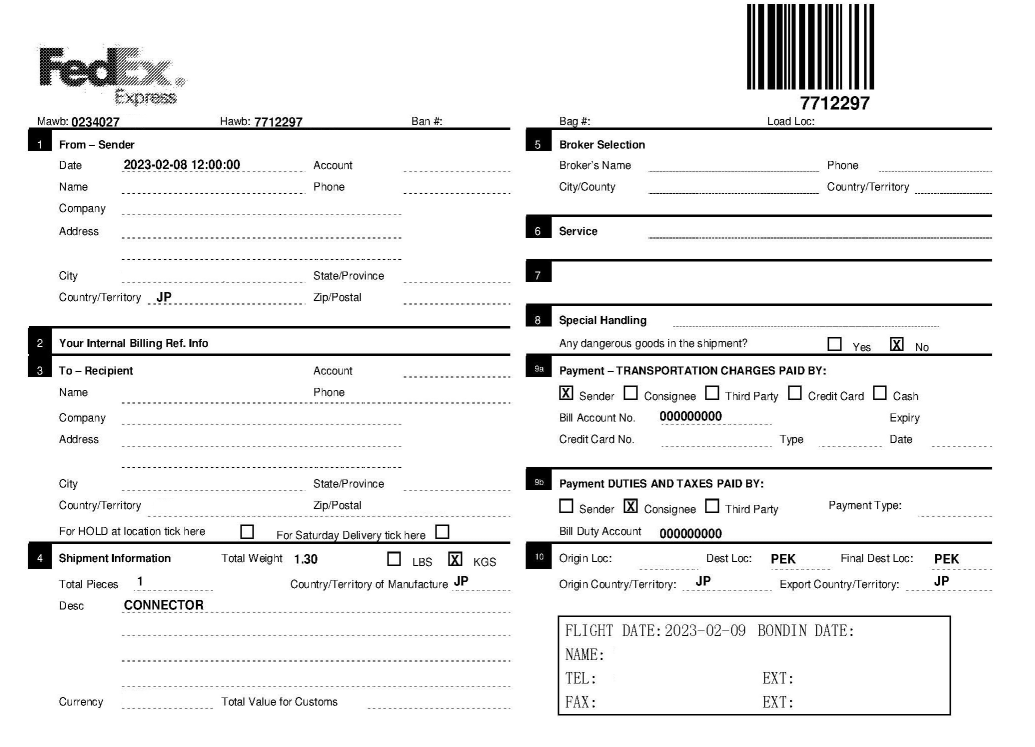 快件進(jìn)口報(bào)關(guān)快遞面單(樣例)
