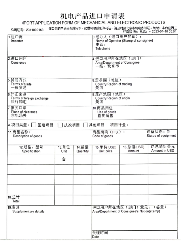 機電產(chǎn)品進口申請表(樣例)