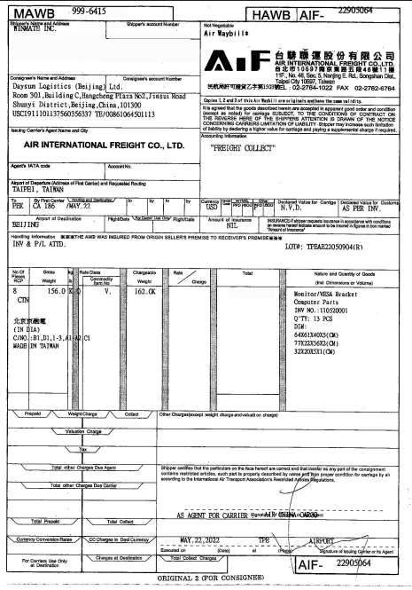 空運(yùn)進(jìn)口報(bào)關(guān)分單(樣例)