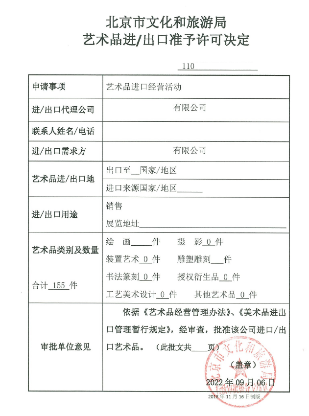 北京市文化和旅游局藝術(shù)品進出口準予決定書(樣例)