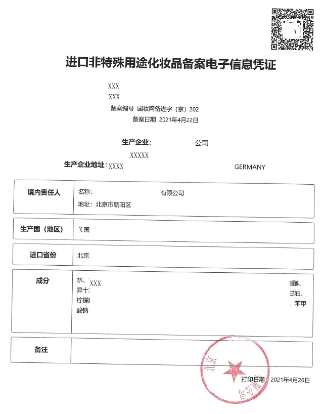 進口非特殊用途化妝品備案電子信息憑證(樣例)