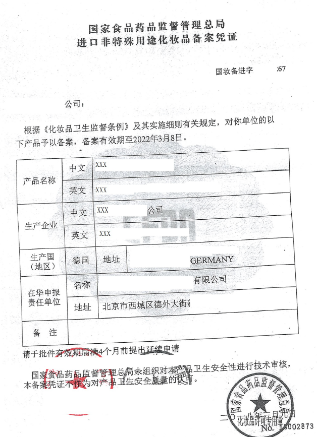 進(jìn)口非特殊用途化妝品備案憑證(樣例)