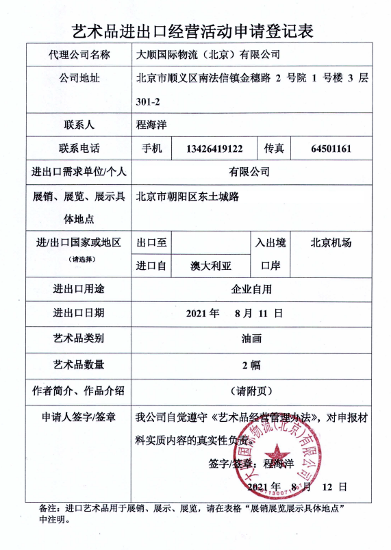 藝術(shù)品進(jìn)出口申請(qǐng)表(樣例)
