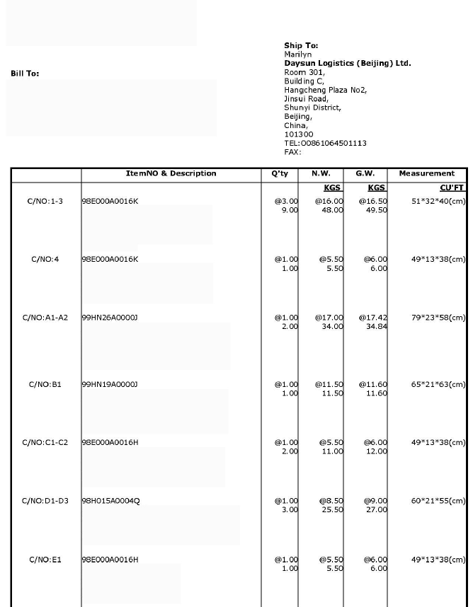 空運、海運、快件-箱單(樣例)