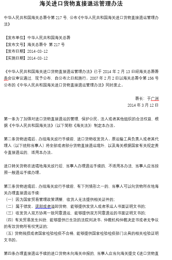 海關(guān)進(jìn)口貨物直接退運(yùn)管理辦法