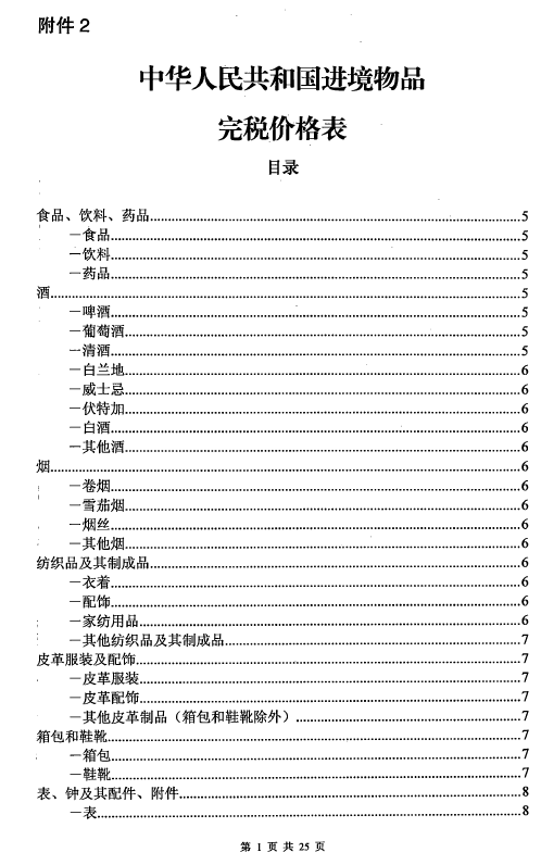 中華人民共和國進(jìn)境物品完稅價格表