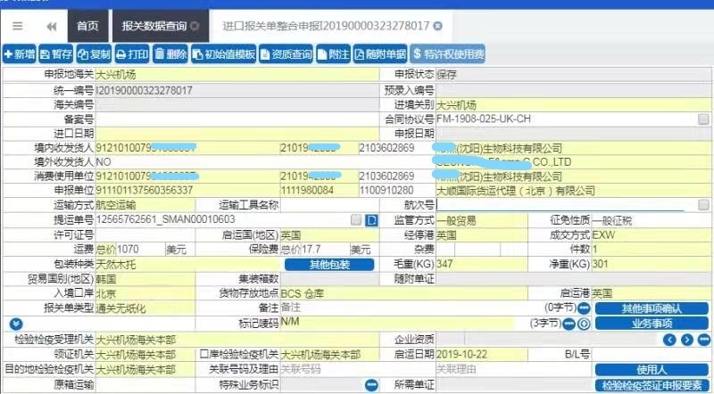 這時,大興海關(guān)的張科長成了我們的大救星。為了幫助我們,他在海關(guān)辦公室面對著海關(guān)報關(guān)系統(tǒng)的界面,用電話一步一步地指導(dǎo)我們的人逐項按照要求填寫正確的新的數(shù)據(jù)項。比如,“申報地海關(guān)”和“進境關(guān)別”必須填寫:大興機場?!皺z驗檢疫受理機關(guān)”、“領(lǐng)證機關(guān)”和“口岸檢驗檢疫機關(guān)”必須填寫:大興機場海關(guān)本部。具體申報界面,如下圖所示: