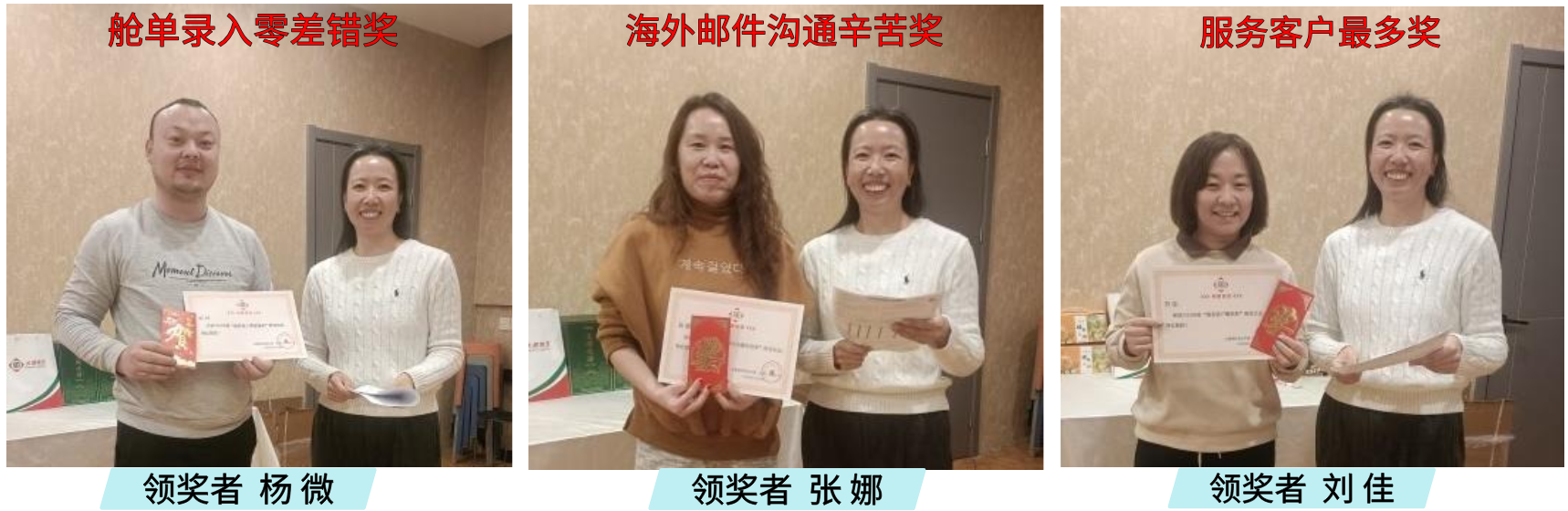 馬健副總經(jīng)理在匯報完各部門的工作后,特為表現(xiàn)出眾的員工頒發(fā)獎項。楊微憑借精湛的業(yè)務(wù)能力和高度的責(zé)任心,確保監(jiān)管庫一年上萬票艙單信息錄入零差錯,榮獲 “艙單錄入零差錯獎”;因業(yè)務(wù)性質(zhì),張娜時常在下班到家后,克服于海外時差等原因,積極回應(yīng)海外代理發(fā)來的郵件,榮獲“海外郵件溝通辛苦獎”;劉佳憑借出色的溝通能力和服務(wù)意識,成功服務(wù)百余個客戶,在應(yīng)對客戶需求時始終保持專業(yè)、耐心和穩(wěn)定的情緒,榮獲“服務(wù)客戶最多獎”。
